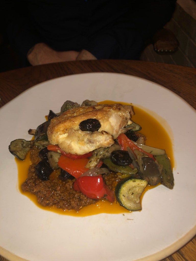 For main, I went for the wild sea bass and Dan ordered the BBQ beef. I asked for a wine pairing with my main and I was advised to order the Chardonnay. I don’t normally drink Chardonnay but as recommended, it was beautiful and light, perfect with the fish.