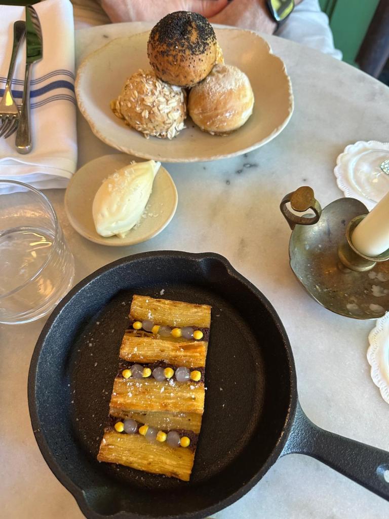 The menu is split into 4 courses, snacks, starters, mains and deserts. As a snack, Dan and I shared the warms breads with whey fat butter and The Pearl chips, which were filled with ox cheek, mustard and dill pickle. Both were equally delicious.
